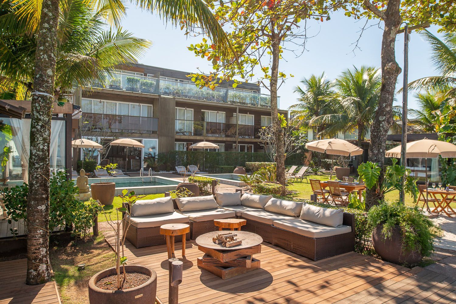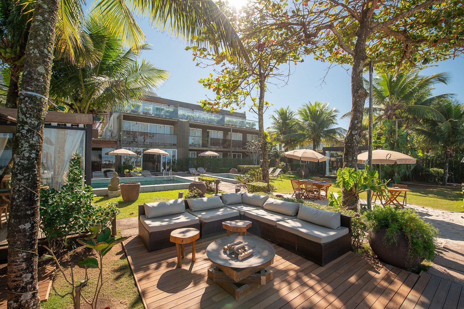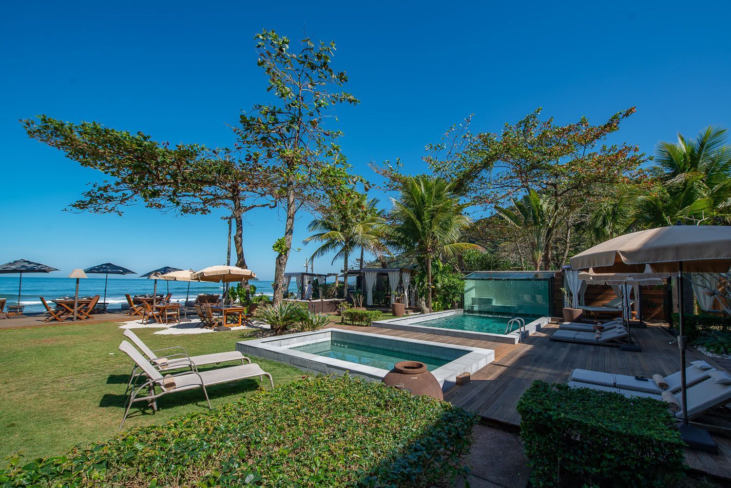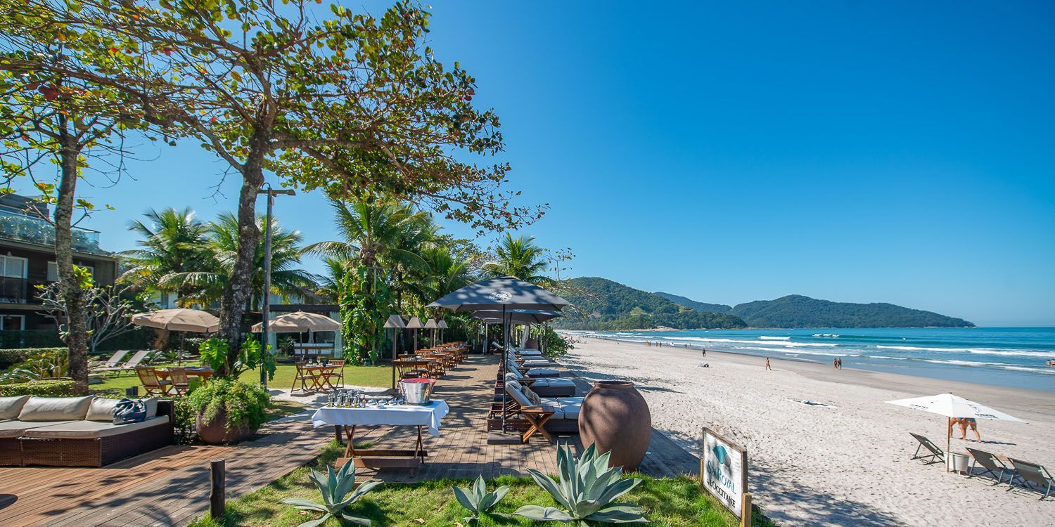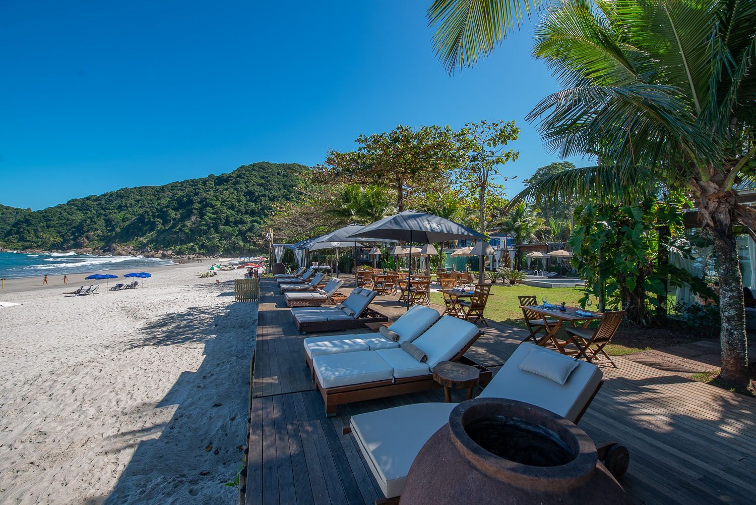 O Deck frente mar flutua sobre as areias de Cambury, com calor do clima tropical e a brisa do mar pra se refrescar, em espreguiçadeiras para casais ou gazebos sombreados nos jardins de ambiente assinado pelo paisagista Marcelo Bellotto.